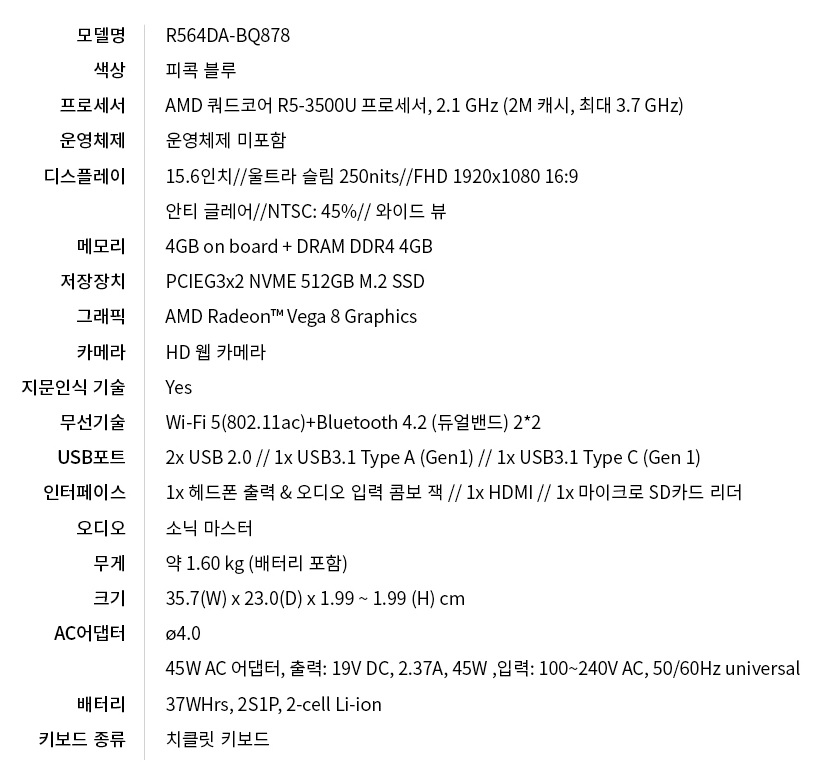 15인치 화면에 AMD 쿼드코어 R5-3500U CPU를 장착하고 8GB램 512GB M.2 SSD 무게는 1.6kg
